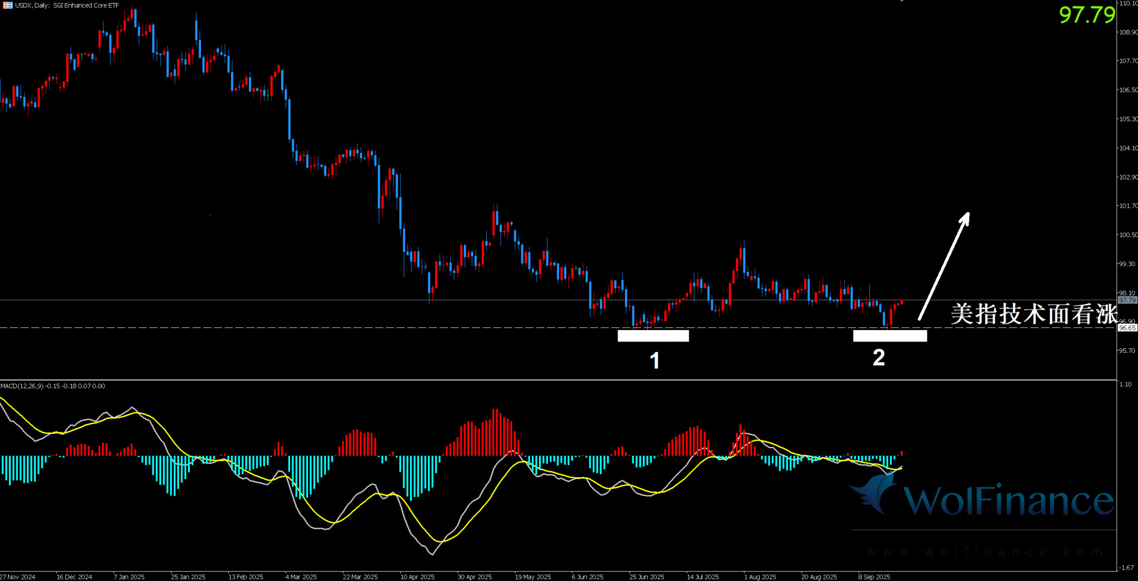 美元指数:图表显示目前美指为震荡下跌行情。