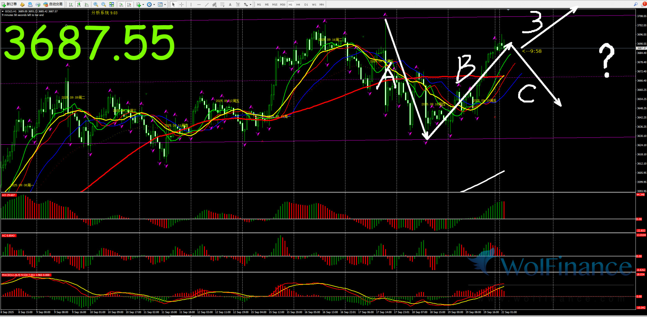 日线级别行情处于5浪行情,关注5浪行情走势,在日线图中关注压力倾向在日线图3710一线附近;支撑倾向在日线图50%(3507);61.8%(3461);四小时行情处于4浪状态,关注4浪的行情走势。支撑倾向在3570附近。1小时图AO零轴上红色,AC零轴上红色,代表在小时图中,行情倾向隔夜小时图处在B浪行情,目前在小时图中关注B浪的行情走势,下方支撑3570附近。在1小时图中,行情上涨压力关注3710附近。