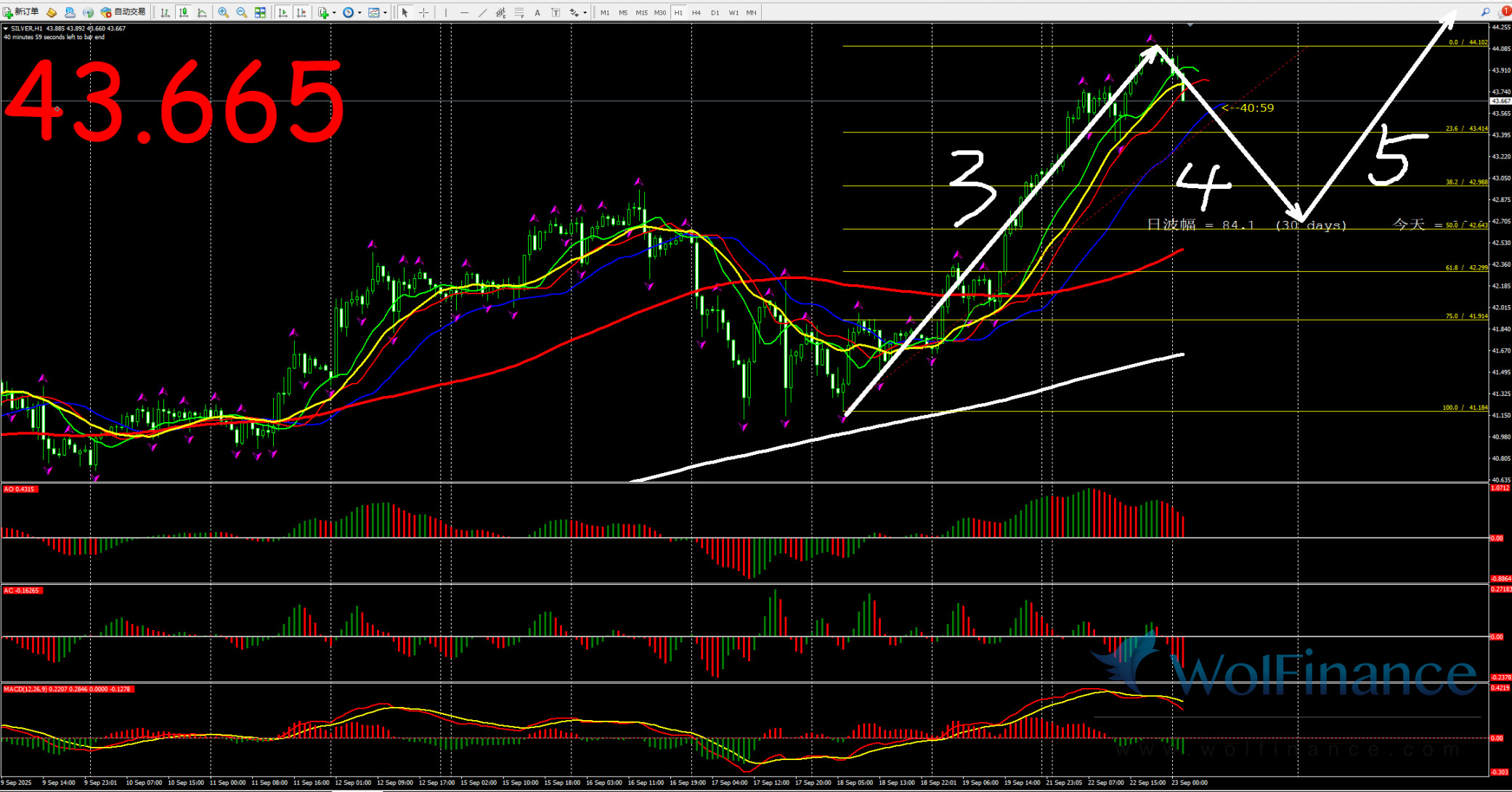 日线图目前处在5浪之中,关注5浪的行情走势。压力倾向在日线图44.10一线附近;支撑倾向在日线图50%(40.15)和61.8%(39.22)一线附近;四小时行情处在5浪走势;并关注上方压力44.10一线附近;1小时图AO零轴上红色;AC零轴下红色,行情在小时图356日线之上运行;小时图关注44.10附近的压力;所以今日关注1小时图震荡行情。
