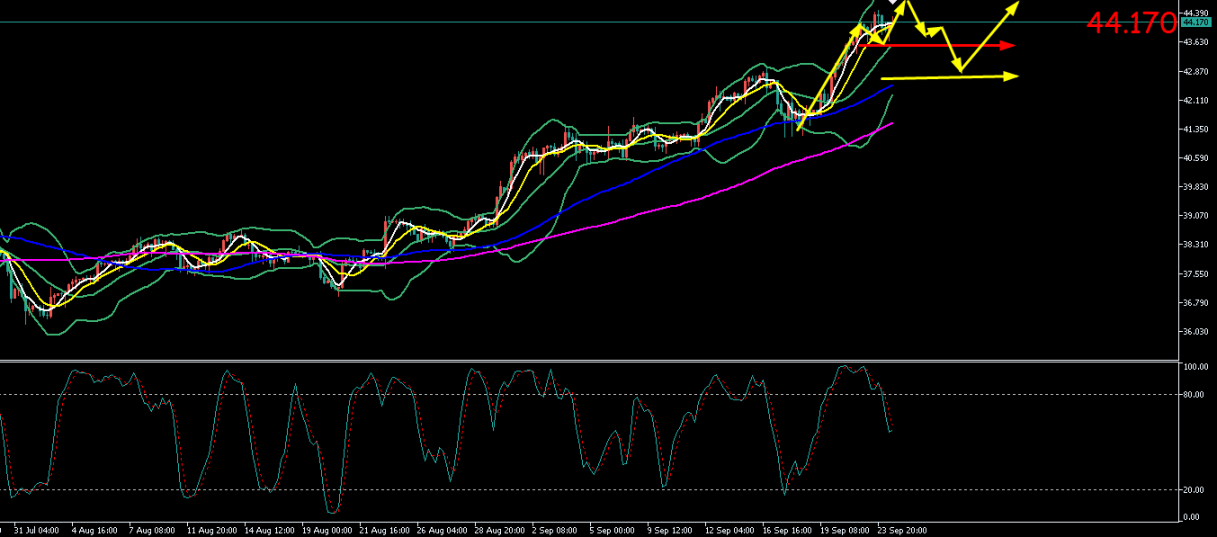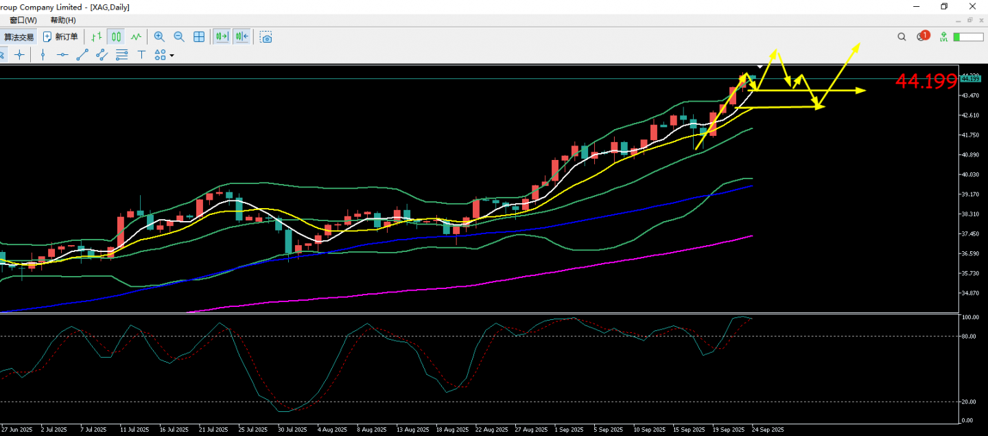白银周二(9.23)最高试探44.1美元/盎司,最低触及43美元元/盎司。收盘于44.05美元/盎司。周二(9.23)开于44.01美元/盎司,截至目前最高上探至44.1元/盎司,最低试探至43.62,现报43.74美元/盎司附近.