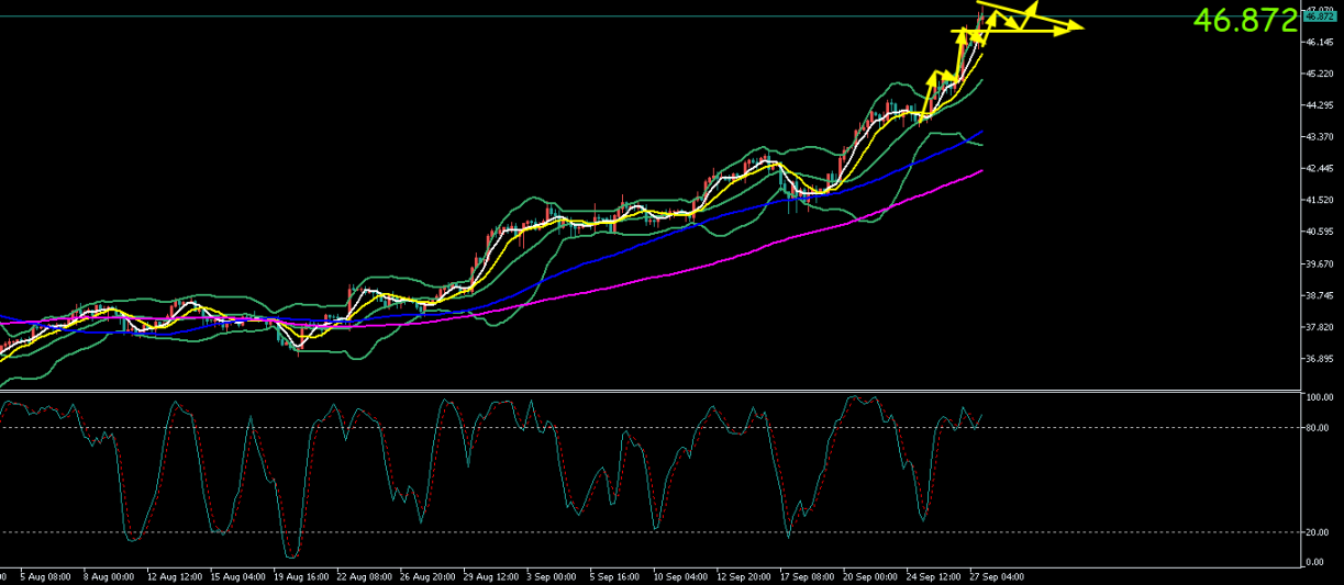 白银周五(9.26)最高试探46.62美元/盎司,最低触及44.58美元元/盎司。收盘于46.02美元/盎司。周一(9.29)开于46.13美元/盎司,截至目前最高上探至47.18元/盎司,最低试探至45.93,现报46.97美元/盎司附近.