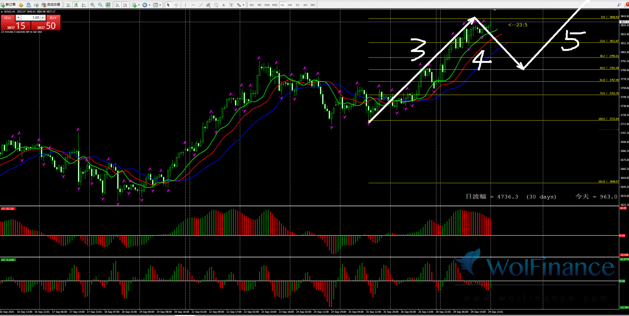日线级别行情处于5浪行情,关注5浪行情走势,在日线图中关注压力倾向在日线图3910一线附近;支撑倾向在日线图50%(3575);61.8%(3514);四小时行情处于5浪状态,关注5浪的行情走势。支撑倾向在3730附近。1小时图AO零轴上红色,AC零轴下绿色,代表在小时图中,行情倾向隔夜小时图处在5浪行情,目前在小时图中关注5浪的行情走势,下方支撑3730附近。在1小时图中,行情上涨压力关注3870附近。