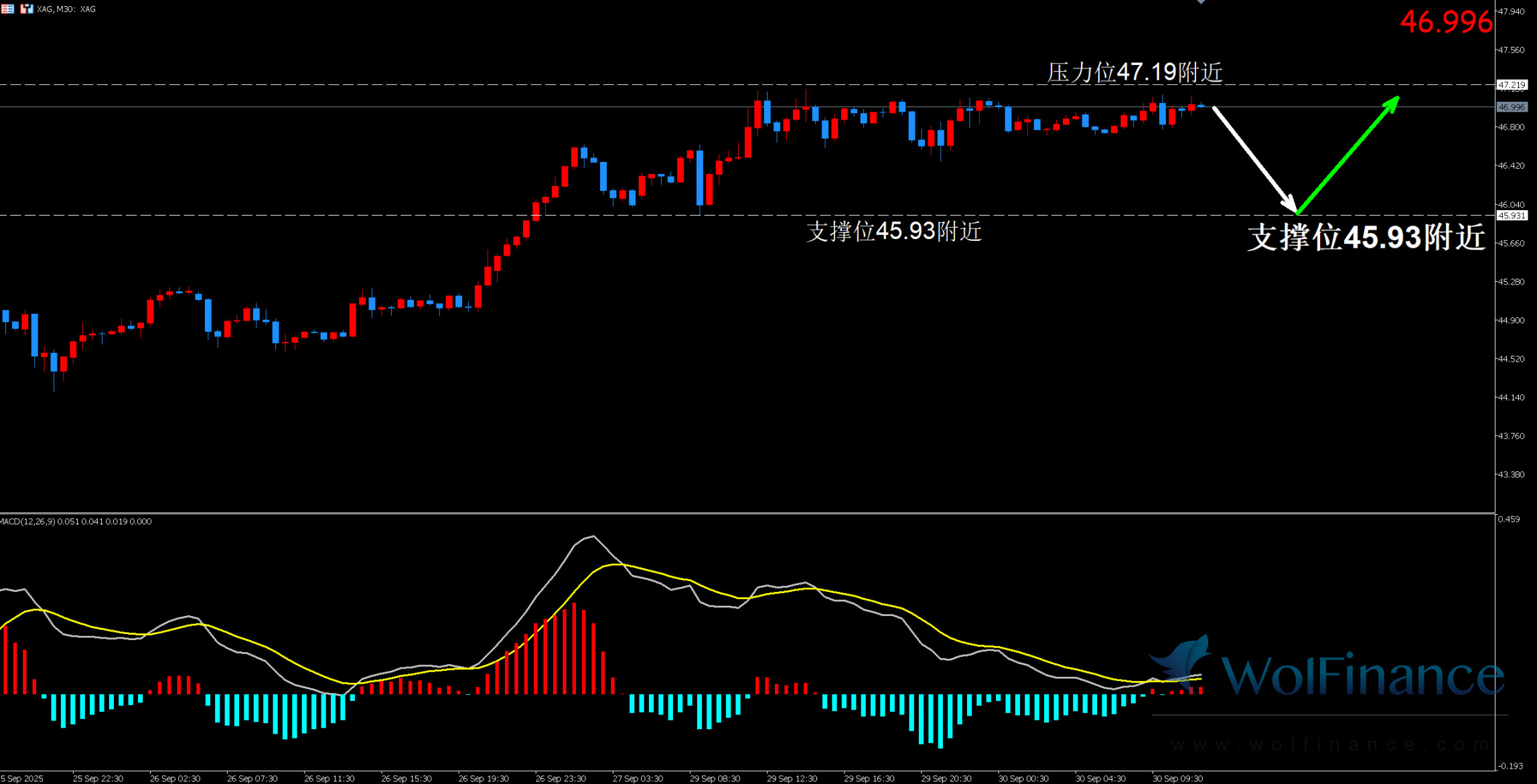 1. 白银技术指标avg显示目前K线在下轨附近运行,小时图周期为行情价格盘整,下方支撑46.30