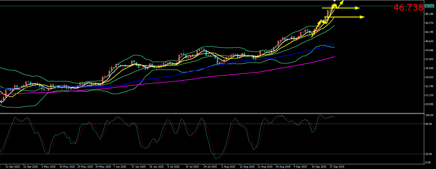 白银周一(9.29最高试探47.18美元/盎司,最低触及45.95美元元/盎司。收盘于46.92美元/盎司。周二(9.30)开于46.92美元/盎司,截至目前最高上探至47.18元/盎司,最低试探至46.71,现报47.1美元/盎司附近.
