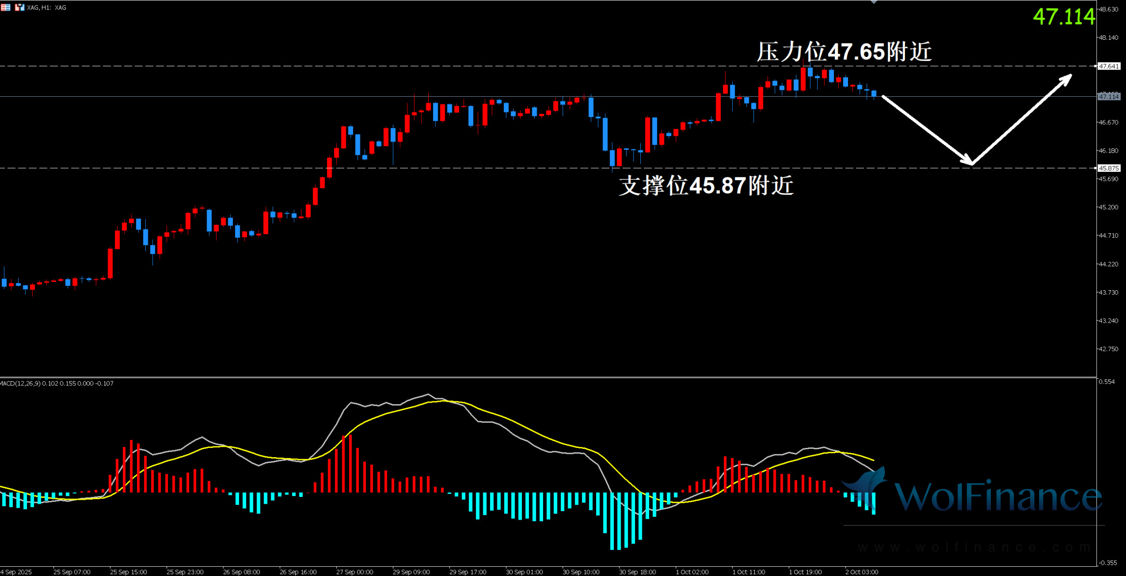 2. MACD图形呈现均线相交箭头向上,目前盘整为主要MACD亚盘方向。能量柱显示波峰平缓且处于能量柱0轴上方且能量减弱。市场活跃 度减弱,交易需要谨慎并且可参考低位多高空轻仓操作。