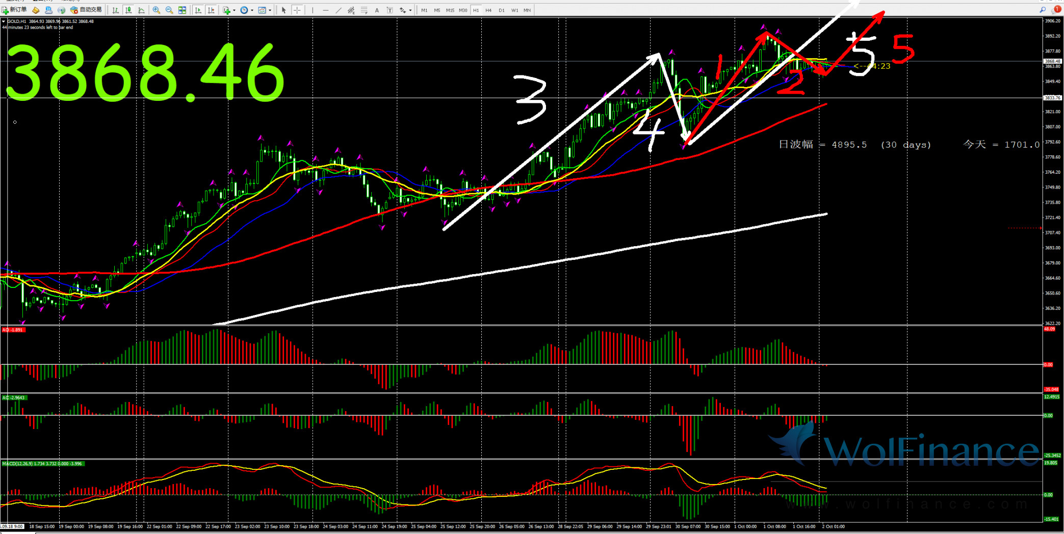 日线级别行情处于5浪行情,关注5浪行情走势,在日线图中关注压力倾向在日线图3910一线附近;支撑倾向在日线图50%(3603);61.8%(3534);四小时行情处于5浪状态,关注5浪的行情走势。支撑倾向在3750附近。1小时图AO零轴下红色,AC零轴下绿色,代表在小时图中,行情倾向隔夜小时图处在5浪行情,目前在小时图中关注5浪的行情走势,下方支撑3750附近。在1小时图中,行情上涨压力关注3910附近。