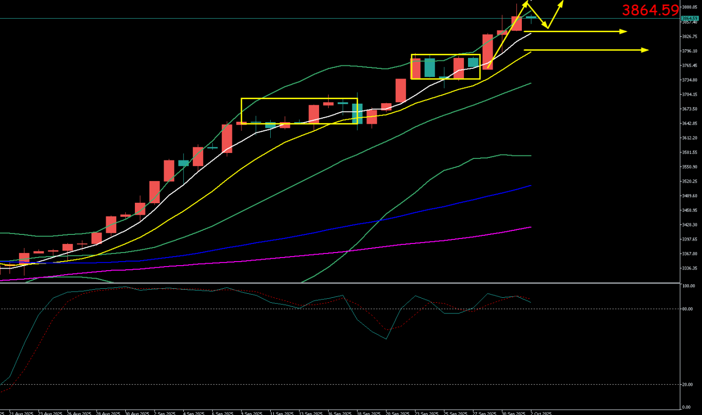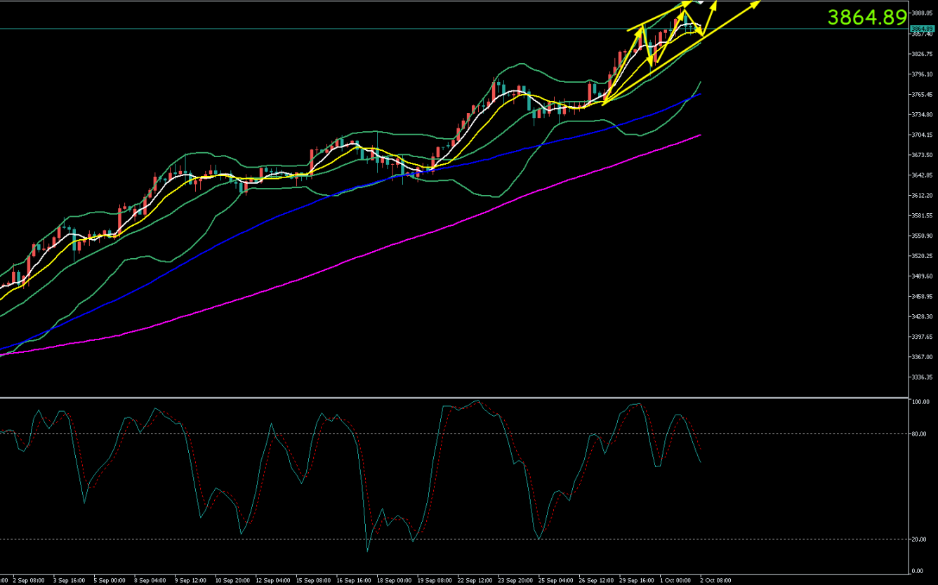 黄金周三(10.1)最高上探至3895.19美元/盎司,最低触及3853.02美元/盎司。收盘于3865.34美元/盎司,周四(10.2)开于3866.45元/盎司,截至目前最高上探至3870.02美元/盎司,最低触及3852.65美元/盎司,行情4小时级别高位震荡,现报价3863.25。