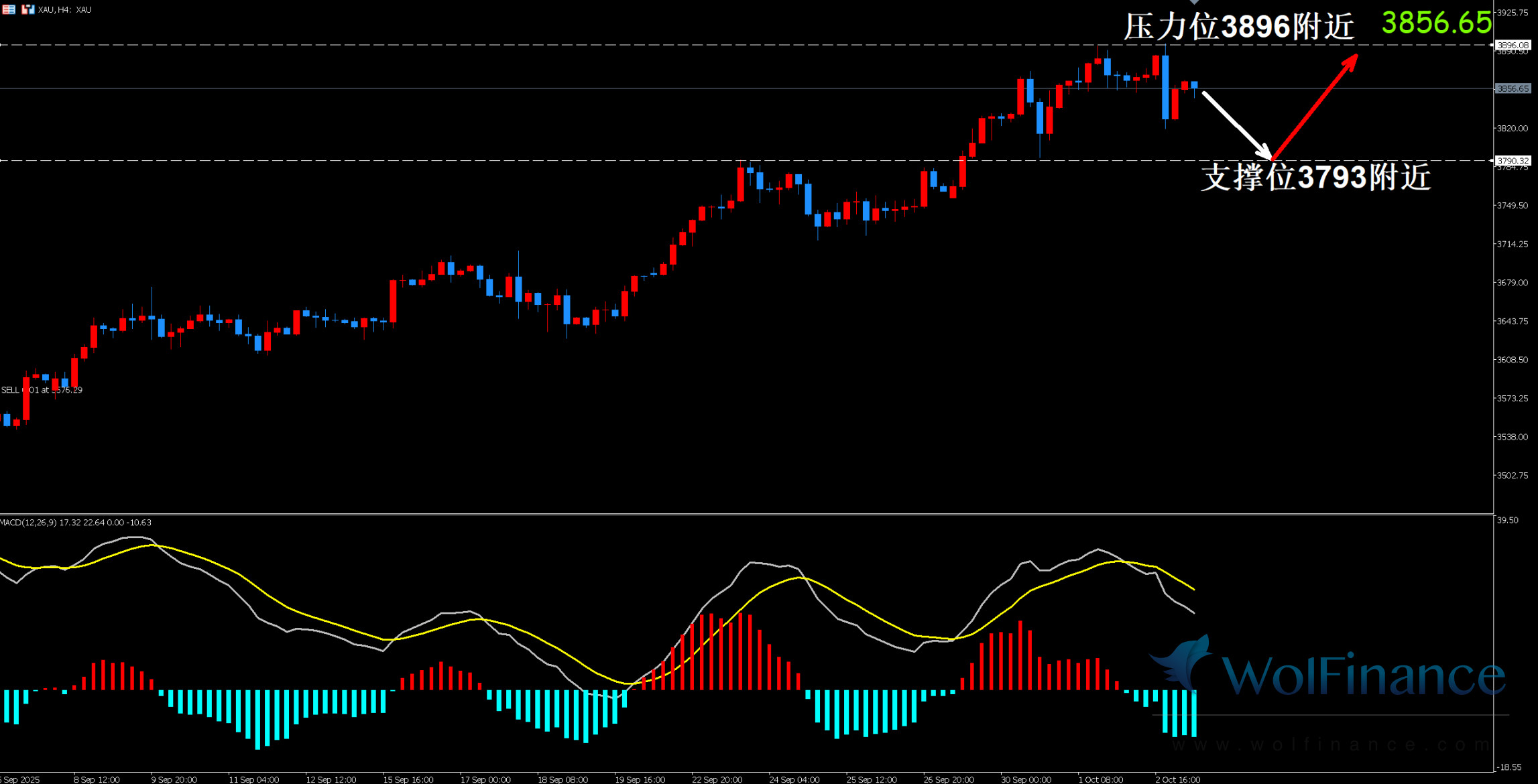 1. 黄金技术显示目前K线在支撑位附近运行,小时图周期为行情价格盘整,下方支撑3795.