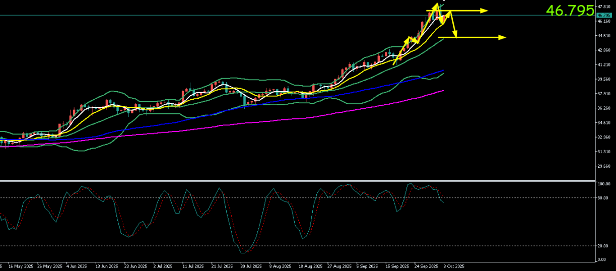 白银周四(10.2)最高试探48.04美元/盎司,最低触及45.9美元元/盎司。收盘于46.99美元/盎司。周五(10.3)开于46.99美元/盎司,截至目前最高上探至47.元/盎司,最低试探至46.63,现报46.8美元/盎司附近.